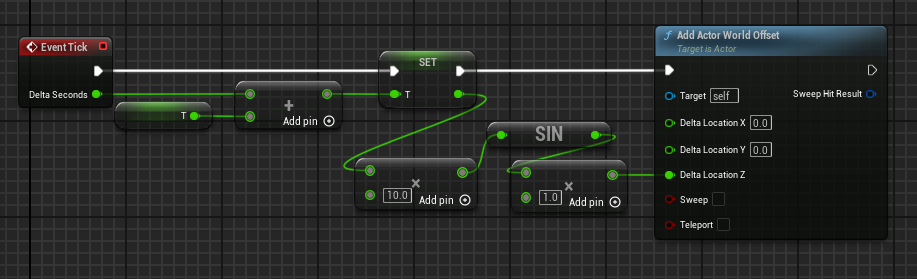 void AItem::Tick(float DeltaTime) { Super::Tick(DeltaTime); RunningTime += DeltaTime; float DeltaZ = Amplitude * FMath::Sin(RunningTime * TimeConstant); AddActorWorldOffset(FVector(0.f, 0.f, DeltaZ)); DRAW_SPHERE_SingleFrame(GetActorLocation()); DRAW_VECTOR_SingleFrame(GetActorLocation(), GetActorLocation() + GetActorForwardVector() * 100); }