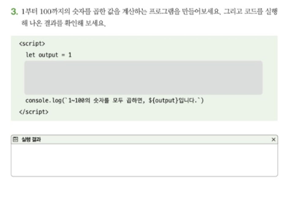 console.log(`1~100의 숫자를 모두 곱하면, &{output}입니다.`)
