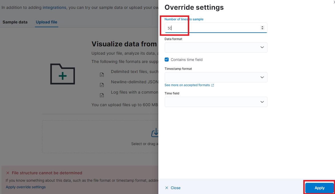 키바나에서 Upload file로 csv, ndjson 등의 파일을 업로드 할 때 오류가 났다.