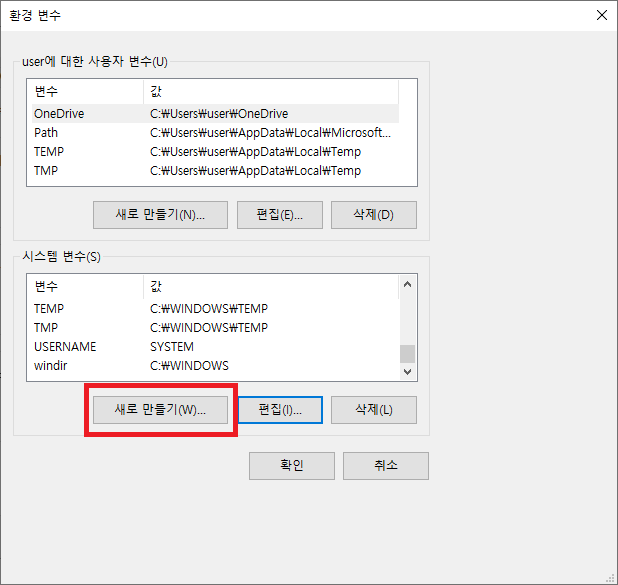 환경 변수 창에서 아래 시스템 변수의 새로만들기 버튼을 클릭해준다.