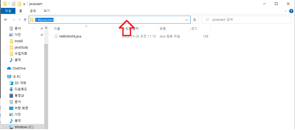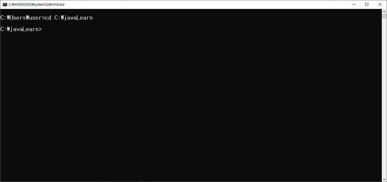그러면 아까 자바 소스파일을 저장한 javaLearn 폴더로 이동해줘야한다.