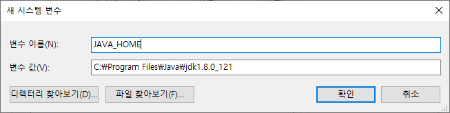 변수 이름은 JAVA_HOME으로, 변수값은 자바가 설치되어있는 위치로 지정해준다.
