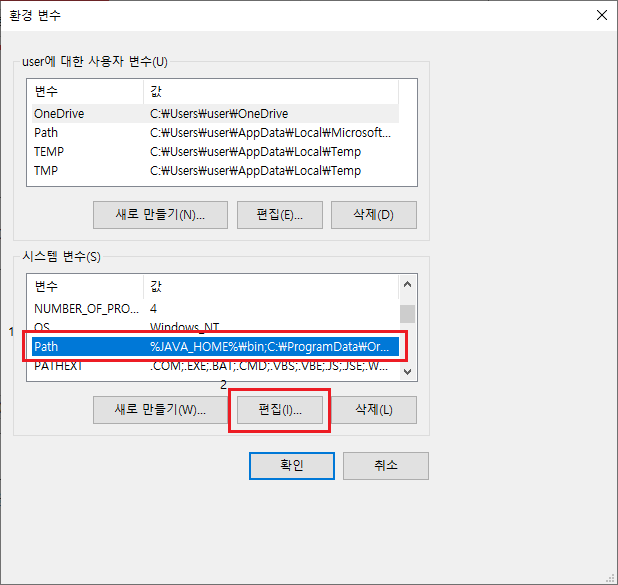 그리고 시스템 변수들 중에 Path 라는 변수를 누르고 편집 버튼을 누른다