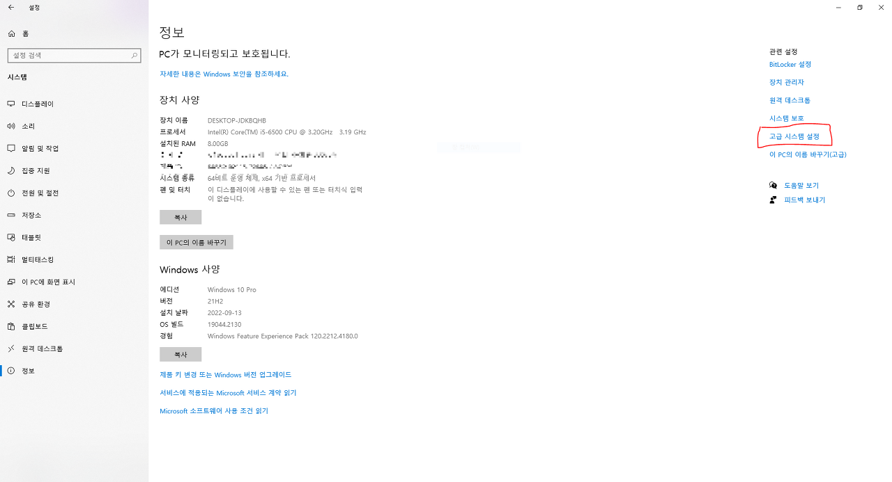 윈도우 설정 - 시스템 - 정보 에 들어가면 오른쪽에 고급 시스템 설정이 있다.