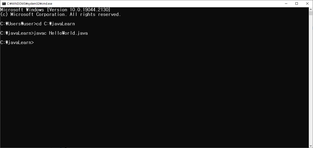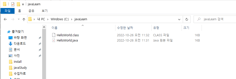 실제로 javaLearn 폴더를 보면 HelloWorld.class 파일이 생성되었다.
