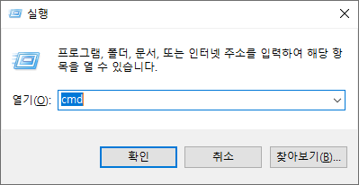 키보드에서 윈도우 키 + R 을 눌러 실행 창을 열어서 cmd 즉 명령프롬프트를 열어준다.