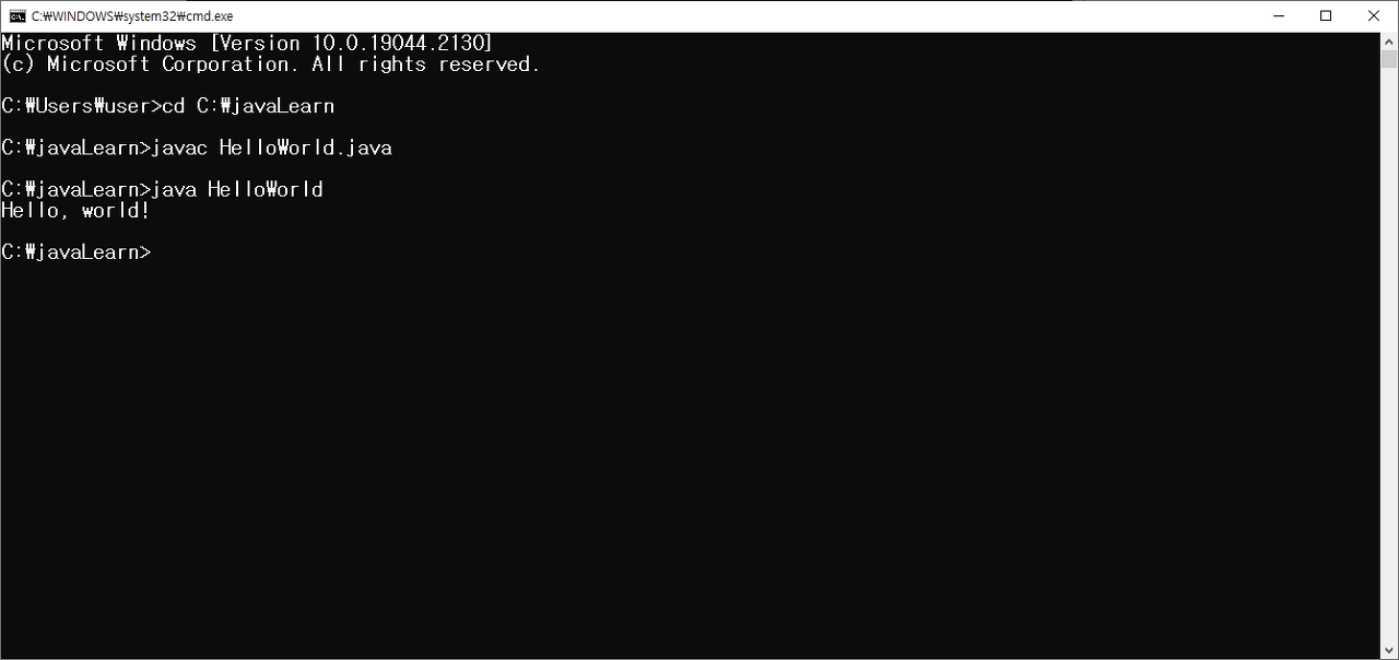 이제 java HelloWorld 를 입력하면 "Hello, world!" 라고 잘 뜬다.