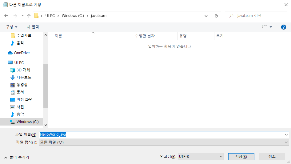 javaLearn 이라는 폴더를 만들어주었다. 그리고 파일 형식은 모든파일 (.) 로 해주고, 파일 이름은