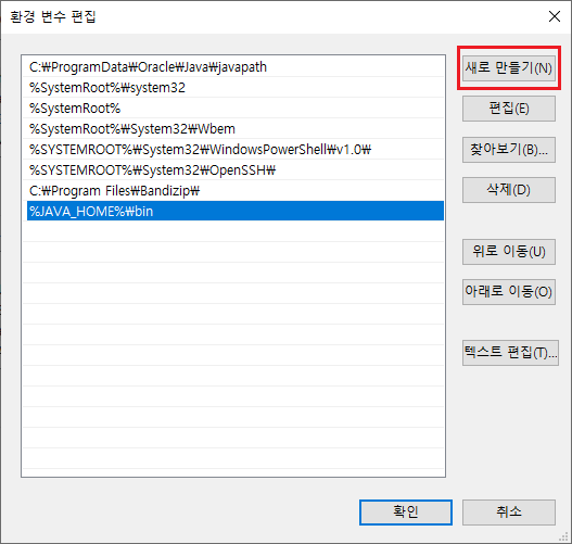 편집 창에서 새로만들기를 누른 다음 %JAVA_HOME%₩bin 을 작성하고 확인을 누른다.