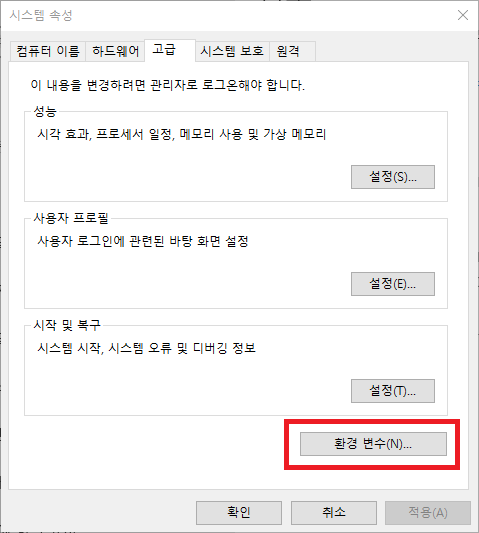 그러면 시스템 속성 창이 뜨는데, 고급 탭에서 환경변수 버튼을 클릭해준다.