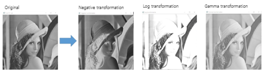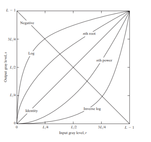 그래프를 자세히 보면 Negative transformation, Log transformation, Gamma transformation, piecewise-linear transformation 등이 존재한다.
