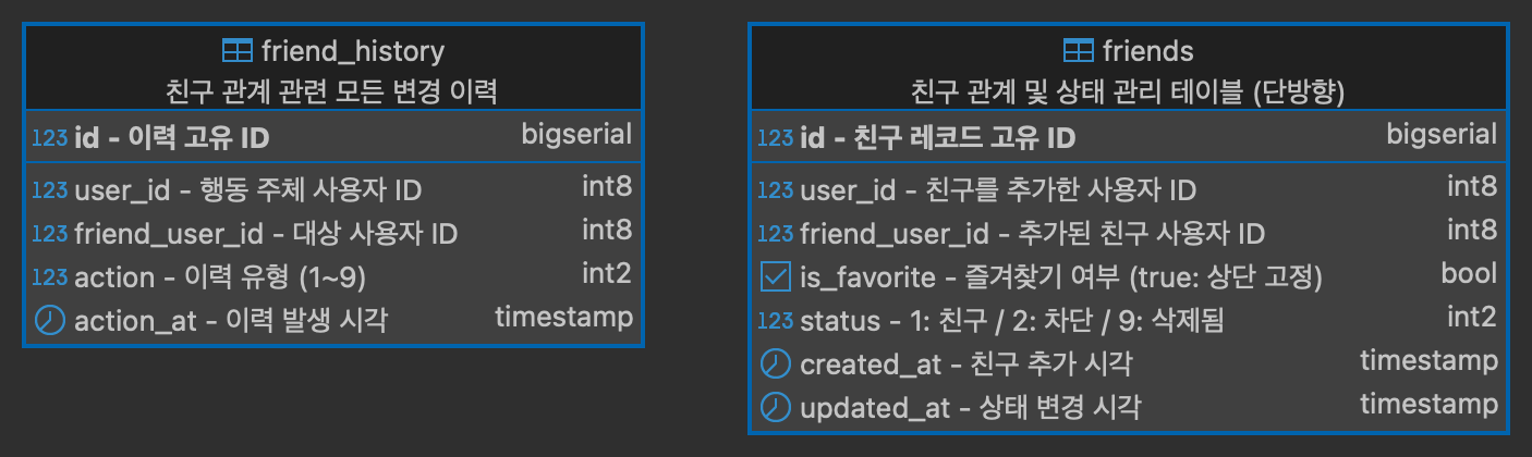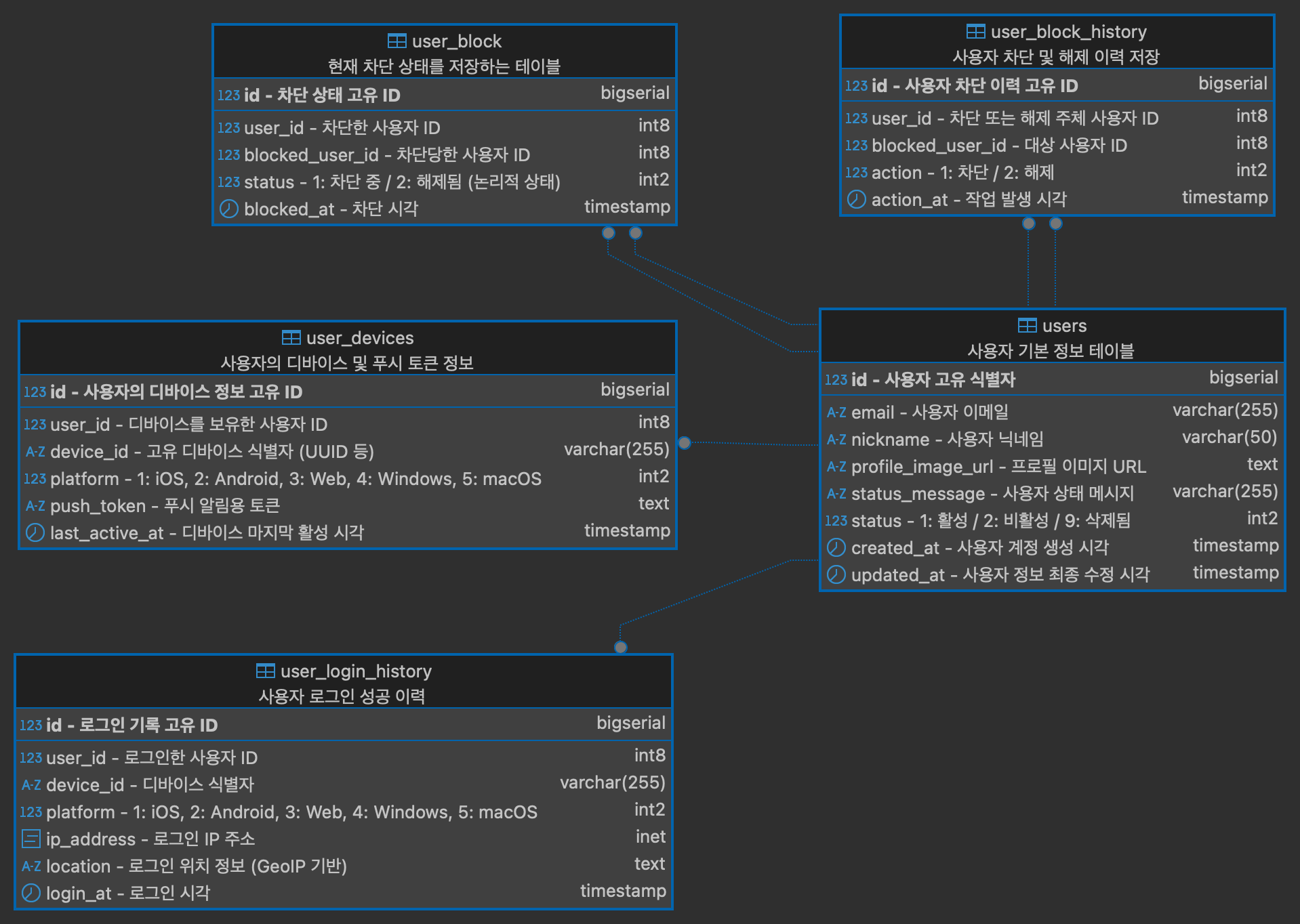 7. 모든 테이블은 물리 삭제 대신 status 또는 left_at을 활용한 논리 삭제 방식을 채택하여 이력 보존, 감사 추적, 데이터 복구가 가능한 안정적인 운영이 가능하도록 구성했습니다.