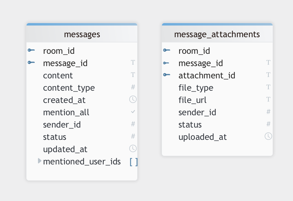 6. message_attachments 테이블에는 sender_id(업로더 ID)를 함께 저장합니다. 이는 비정규화 구조이지만, 메시지 없이 첨부파일만 조회할 경우에도 사용자 정보가 필요하기 때문에 포함했습니다.
