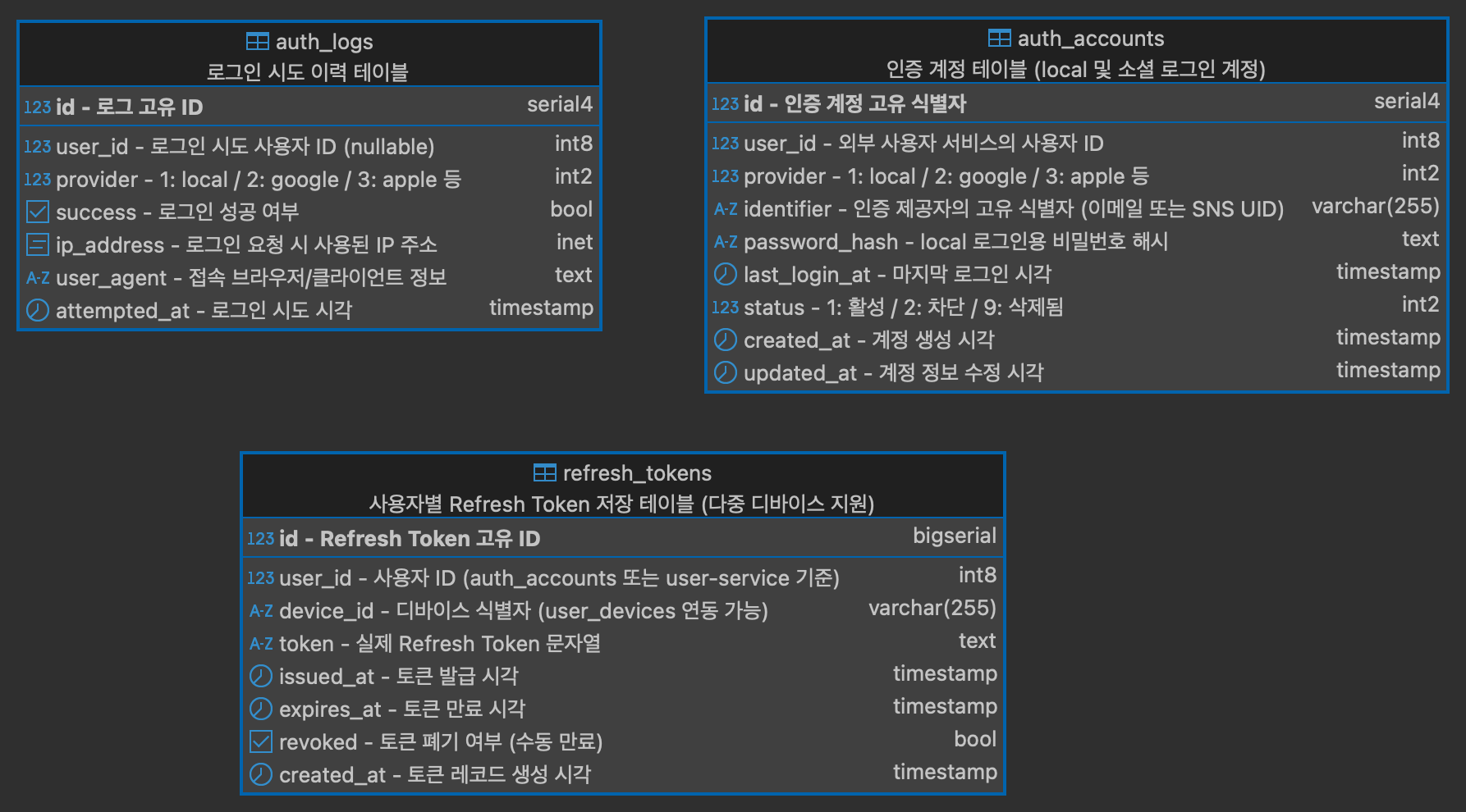 10. 테이블 간 관계는 같은 DB 내에서만 외래키로 설정하며, 외부 DB 간(user_db 등) 관계는 설정하지 않았습니다. 이는 마이크로서비스의 독립성을 지키기 위한 전략으로, 필요 시 서비스 간 통신이나 이벤트로 연결합니다.