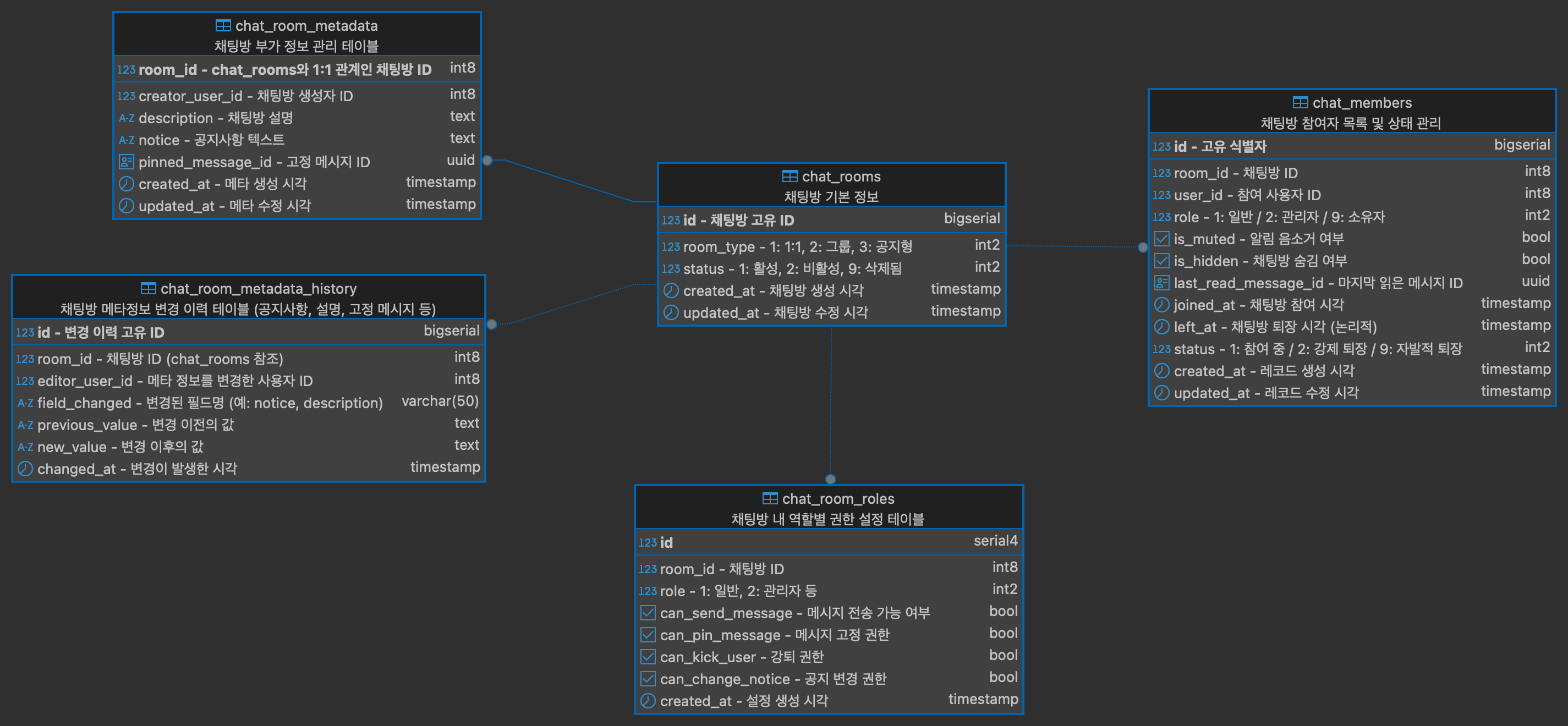 8. chat_room_metadata의 pinned_message_id 와 chat_members의 last_read_message_id는 메시지 저장소인 cassandra의 message id를 참조하므로, 해당 필드는 UUID 타입으로 설정하였습니다. 이로 인해 메시지와의 연결성을 유지합니다.