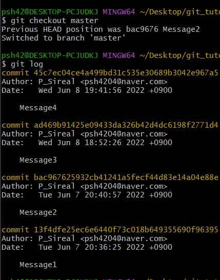 git checkout master : 최신상태로 다시 돌아감.