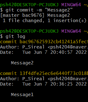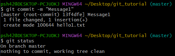 git commit -m : 직접 메시지를 쓰고싶을 때 사용하는 명령어