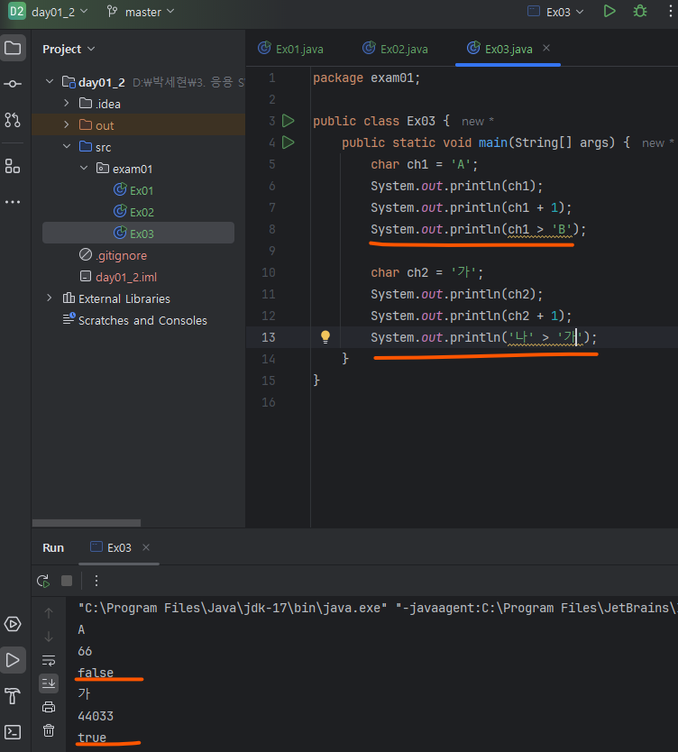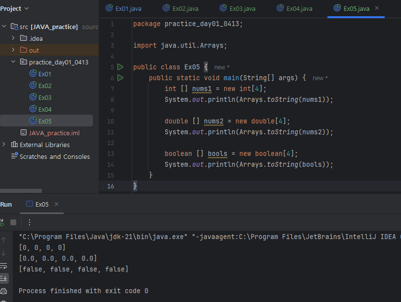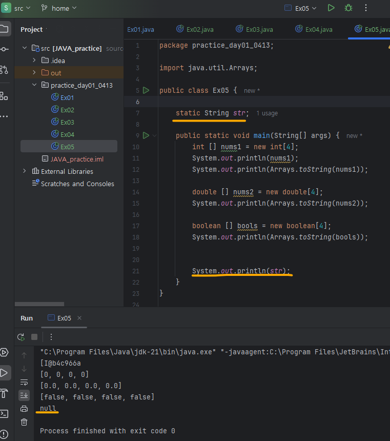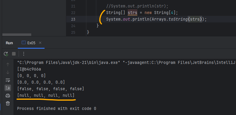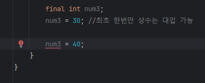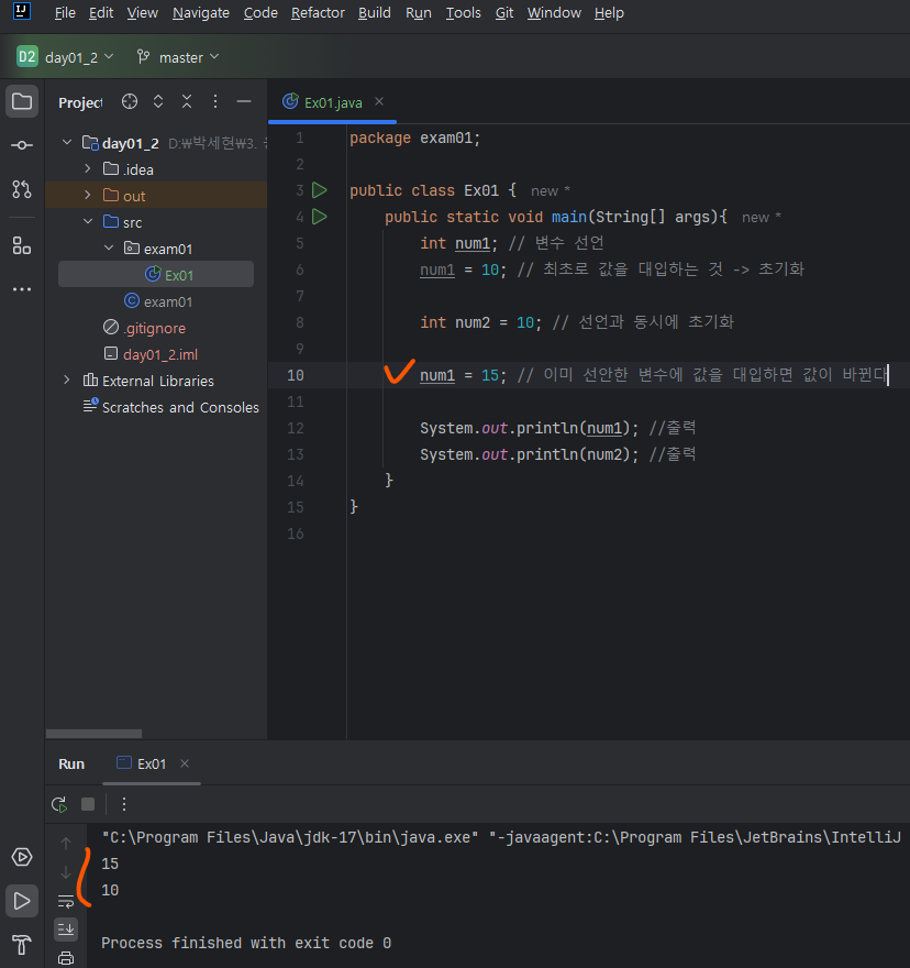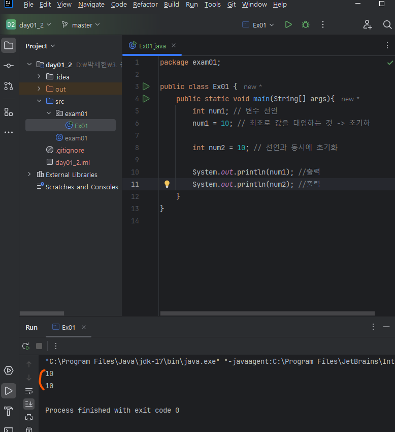 - 선언만 하고 값을 넣지 않으면 메모리만 만들어지게 되는데 기본자료형 같은 경우 값을 넣지 않으면 초기값이 대입된다