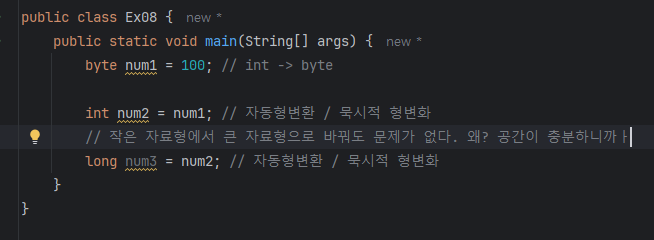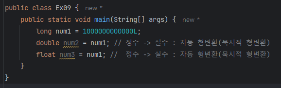 byte -> short -> int -> long -> float -> double : 자동 형변환
