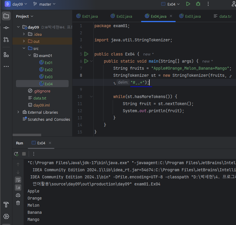 ㄴ StringTokenizer st = new StringTokenizer(fruits, "#"); : 토큰이 # 이다