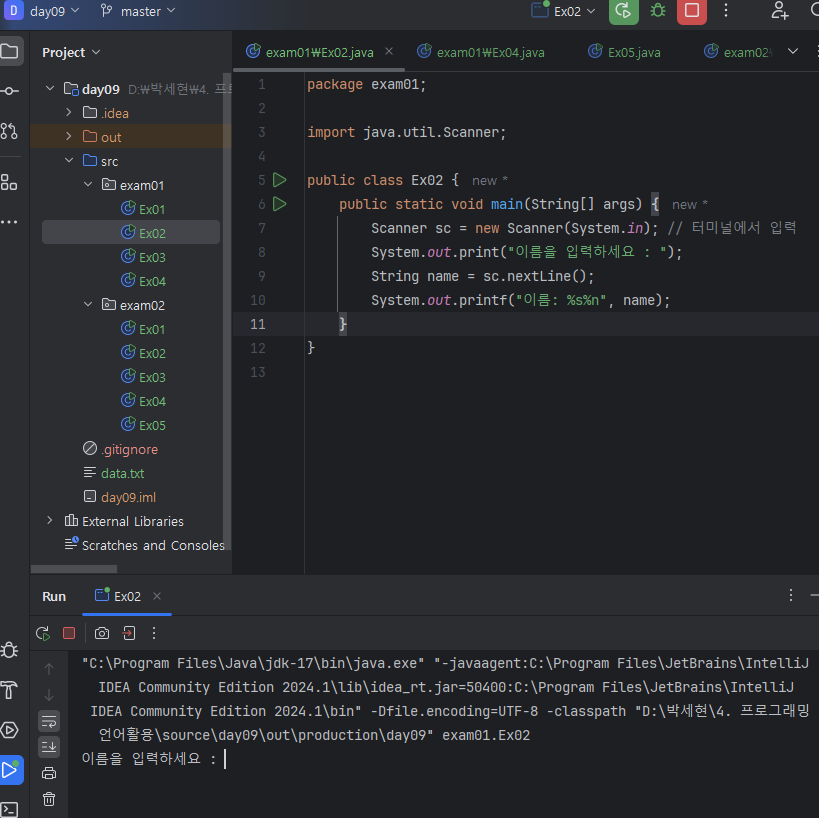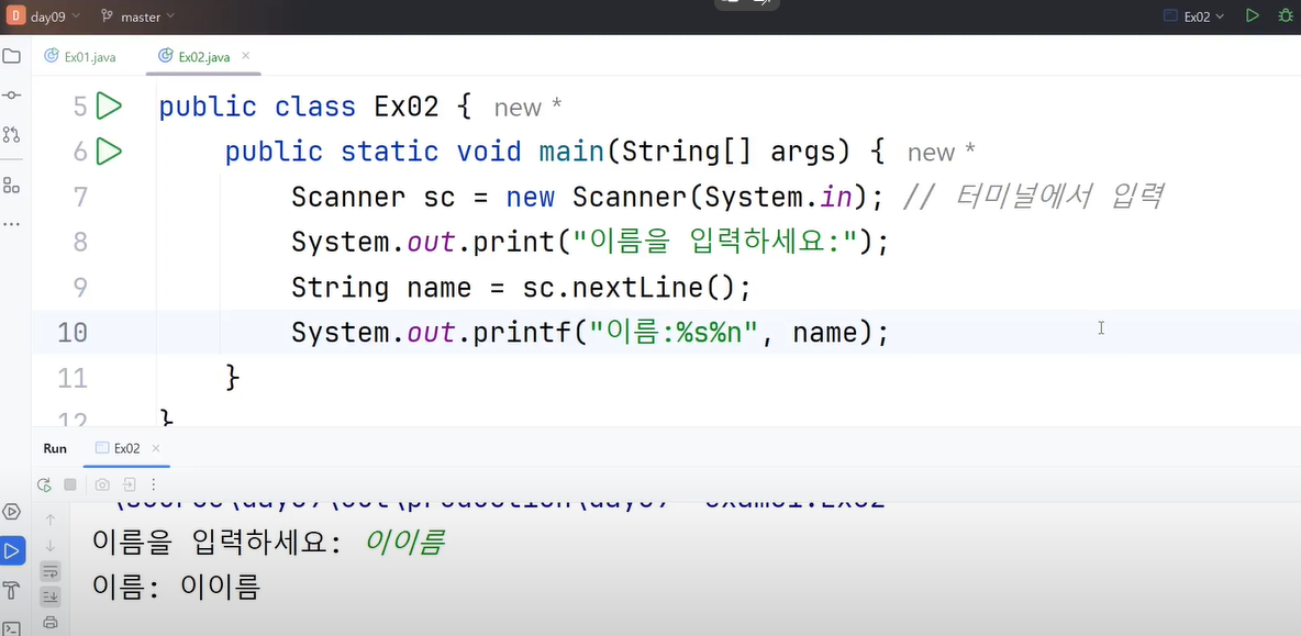 -> scanner쪽에 System.in을 매개변수로 넣으면 터미널 쪽에서 입력할 수 있도록 해줌