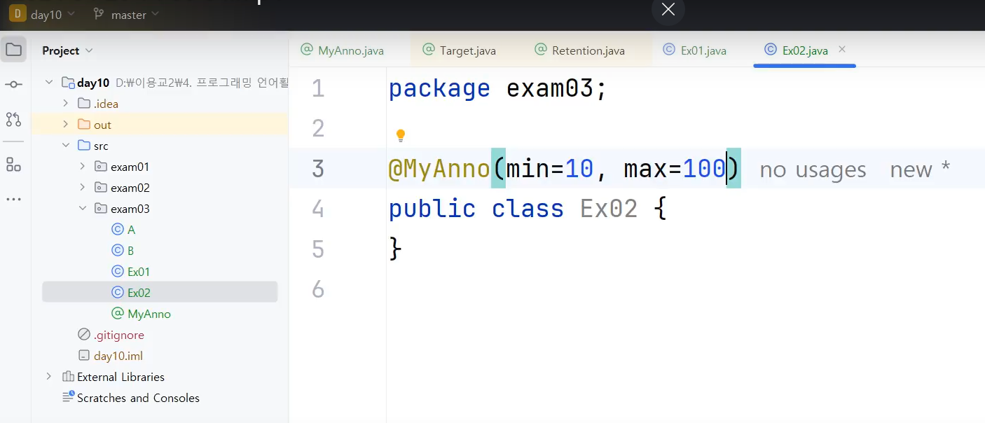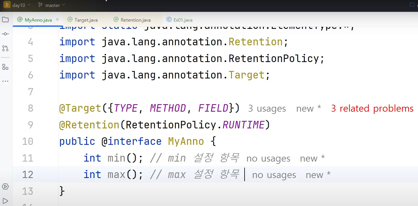 ㄴ MyAnno 에노테이션에 int min();, int max();추상메서드 정의