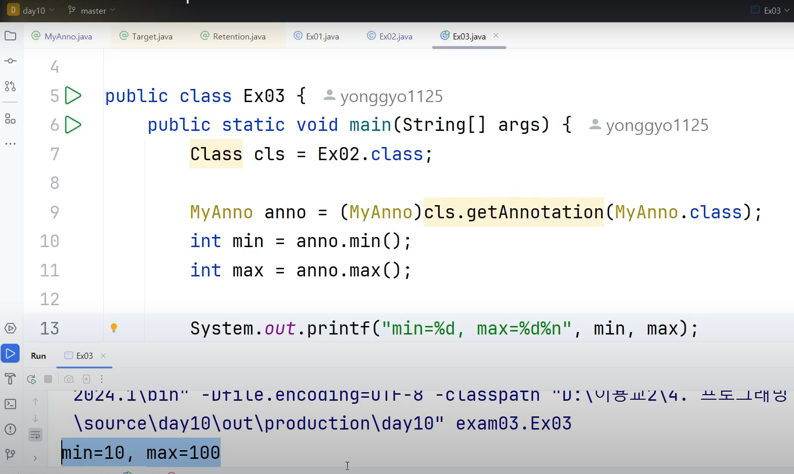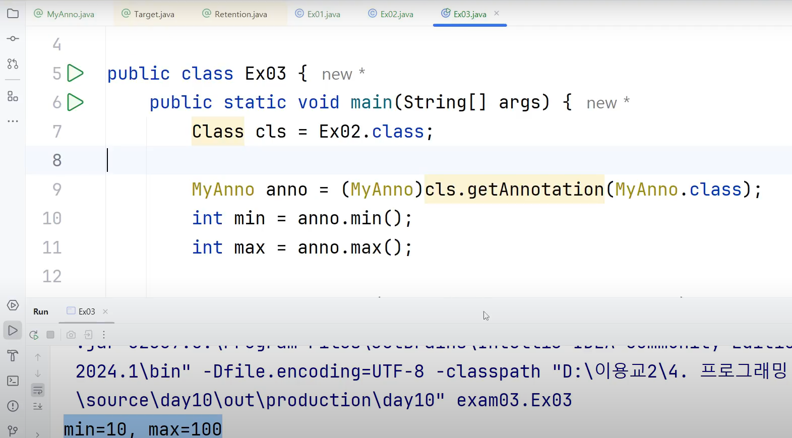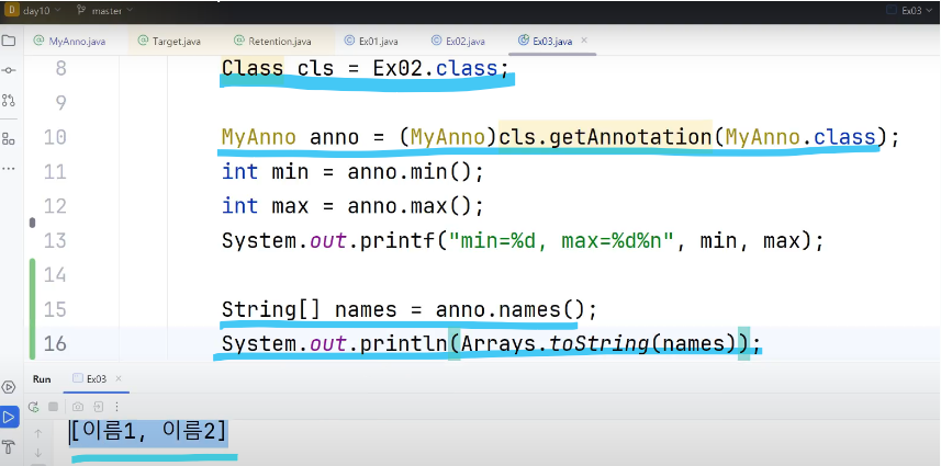 ㄴ @MyAnno에노테이션은 추상메서드에 불과 = @MyAnno(min=10, max=100) 에서 10, 100은 설정만 한 것 뿐이지 아직 이 값이 반환값인건 아님