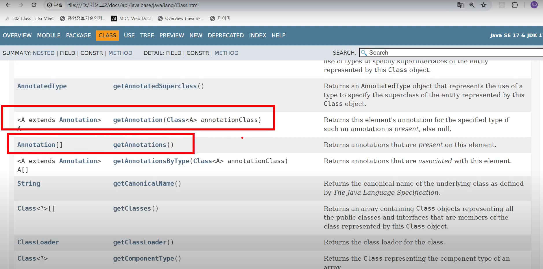 ㄴ 그래서 자바문서 java.lang.class에 에노테이션 확인 가능 메서드 있음
