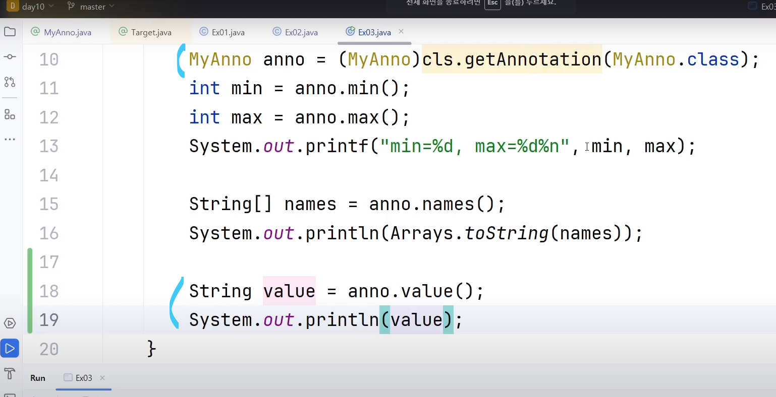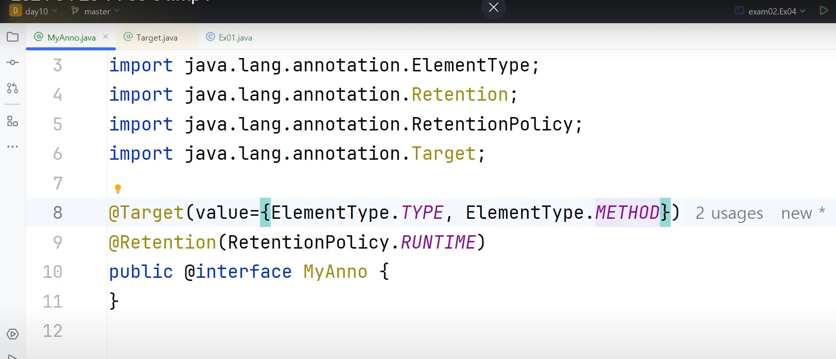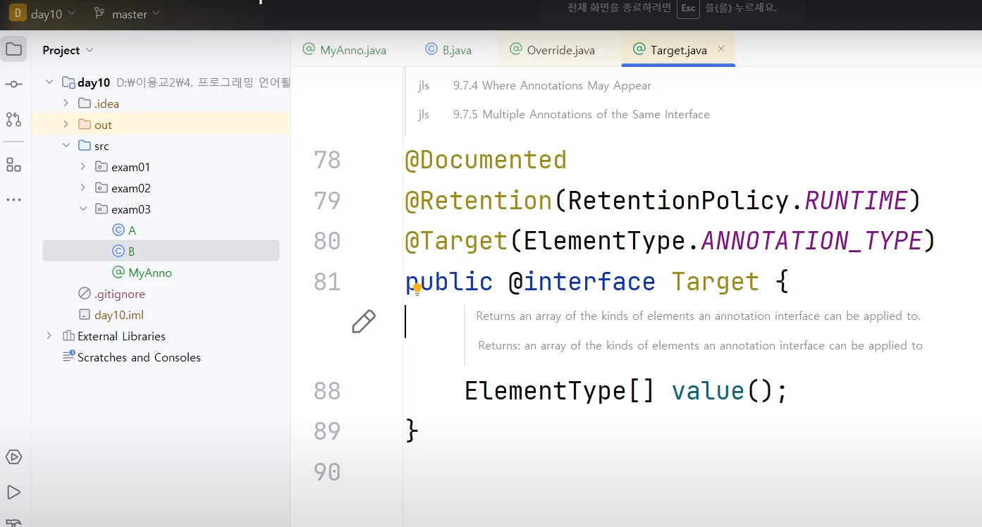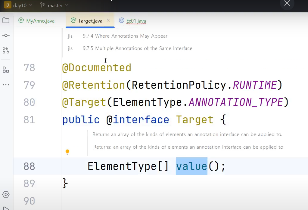ㄴ MyAnno 에노테이션클래스에 정의한 @Target(ElementType.Type) 에서 ()쪽에 입력된 값은 value()에 할당된 것