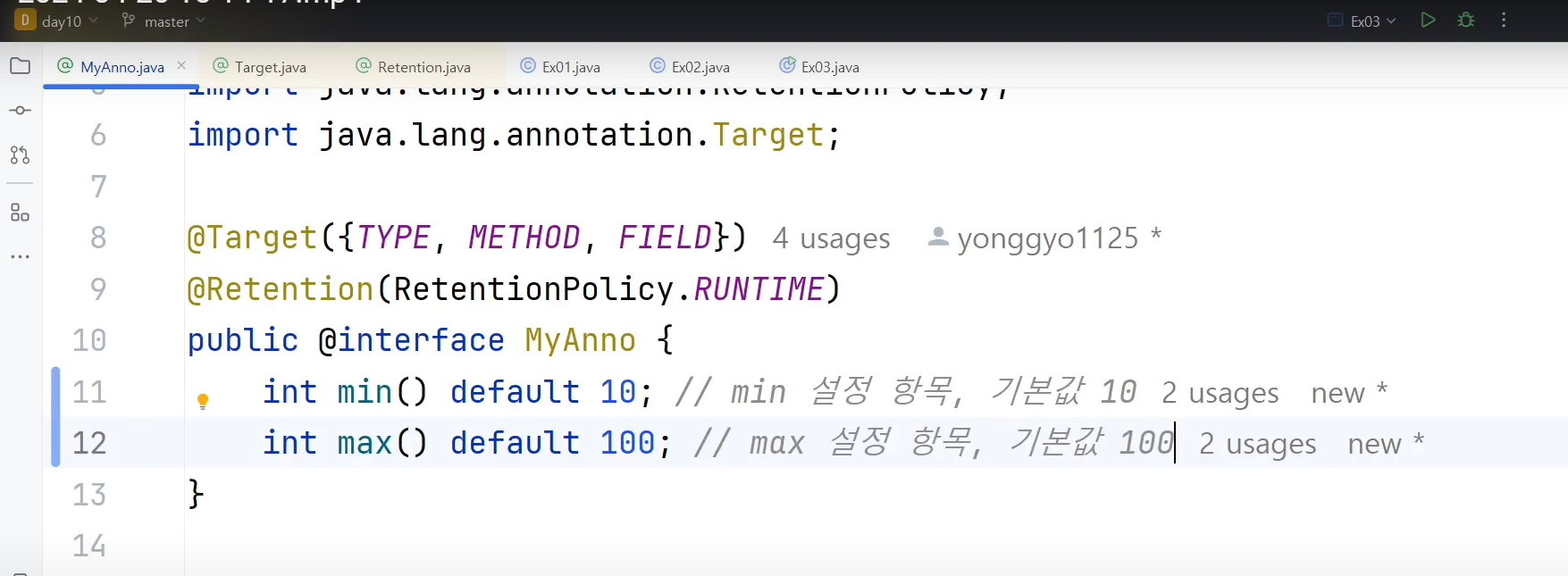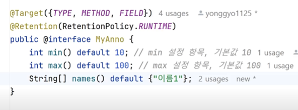 @MyAnno(value = "이름1") //이렇게 설정항목에 설정추가해주는게 정석이지만