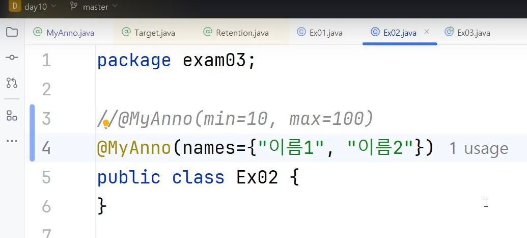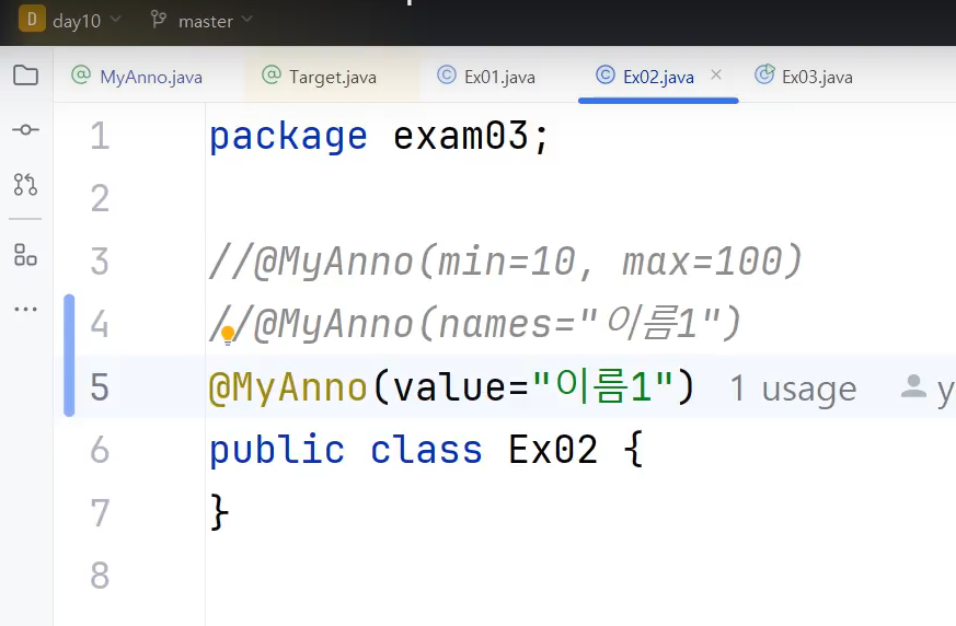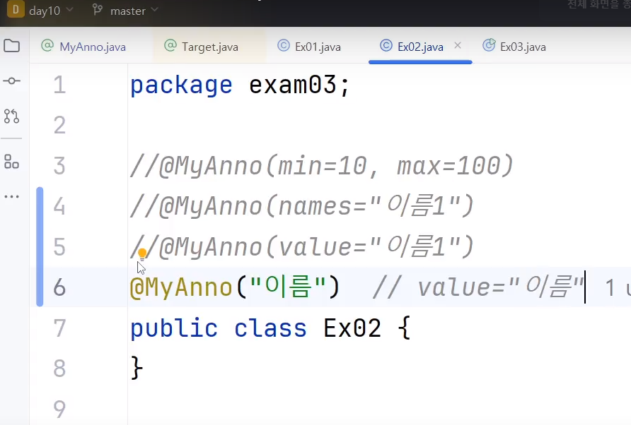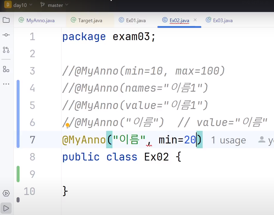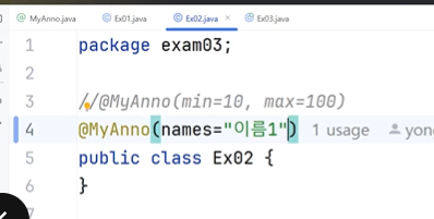 @MyAnno("이름1") // 설정추가가 한개만인경우 이렇게 생략가능