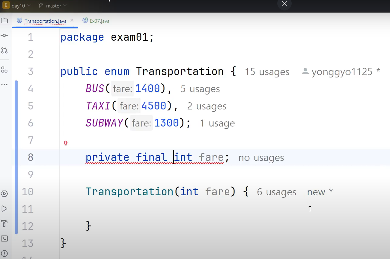 ㄴ private final int fare; 초기화 해 줌