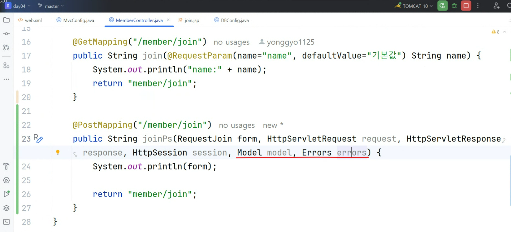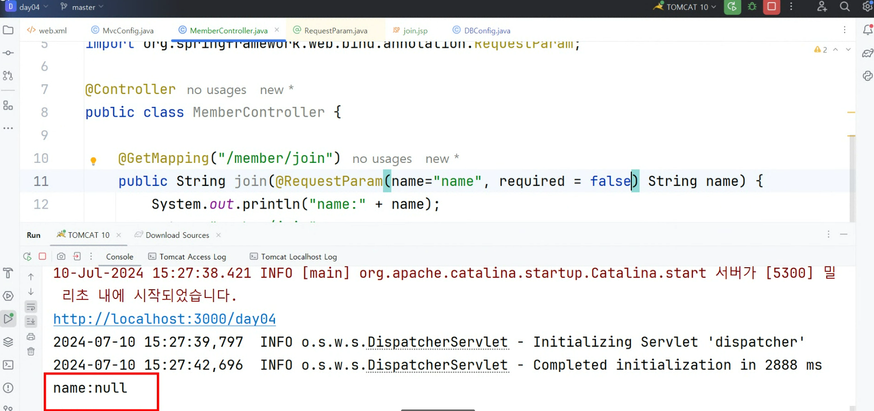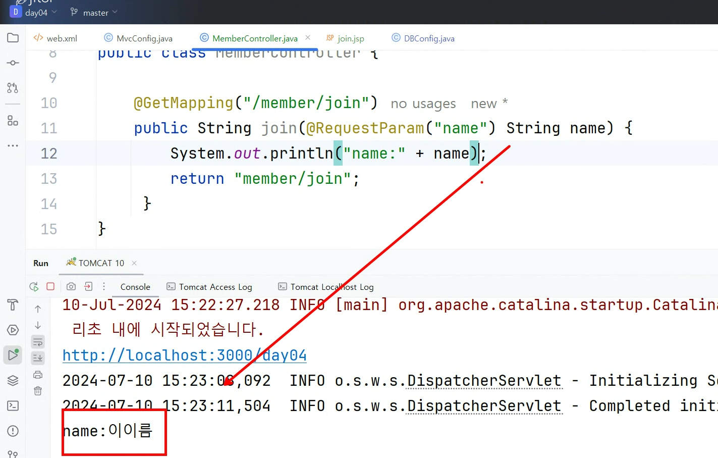 1) 요청 데이터의 이름과 동일한 매개변수를 요청 메서드에 정의하면 자동으로 주입