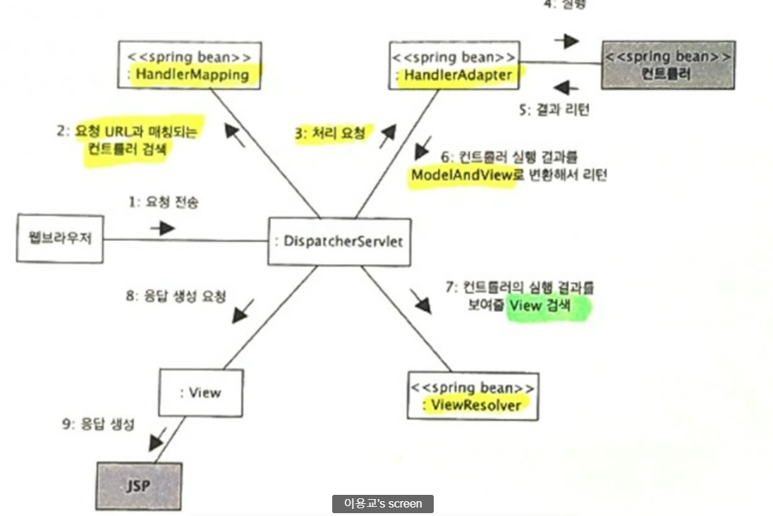: 형태가 다양한 컨트롤러 빈(@Controller, Controller 인터페이스, HttpRequestHandler 인터페이스) -> 실행 -> ModelAndView로 반환