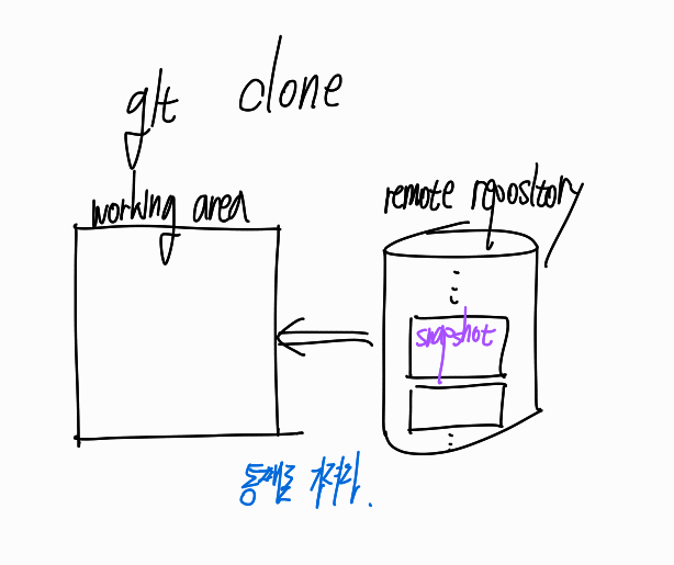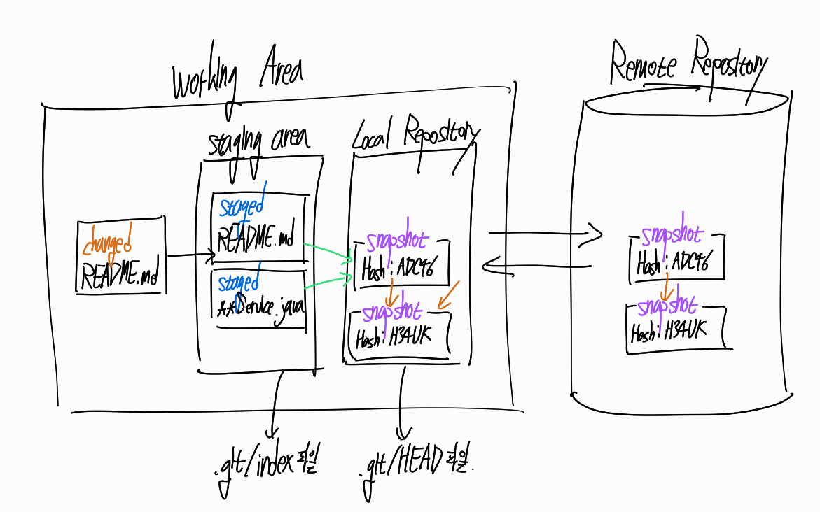 을 통해 snapshot으로 만들어집니다. 이렇게 만들어진 snapshot은 파일에 어떤 내용이 기록되어 있는지 등의 모든 정보가 담겨진 하나의 상태입니다. 이는 local repository에 저장됩니다.