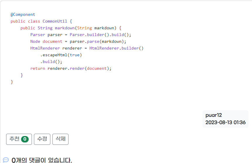 교재에서 활용한 commonmark 라이브러리를 활용하여 기존 방식대로 마크다운 문법을 HTML 태그 등으로 전환하고, 렌더링해서 보여줄 때 일부 태그만 허용하도록 구현하여 XSS 공격을 대비하고자 함