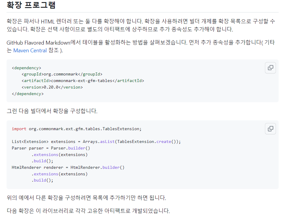 implementation 'org.commonmark:commonmark-ext-gfm-tables:0.20.0' // 테이블 관련 추가 설정