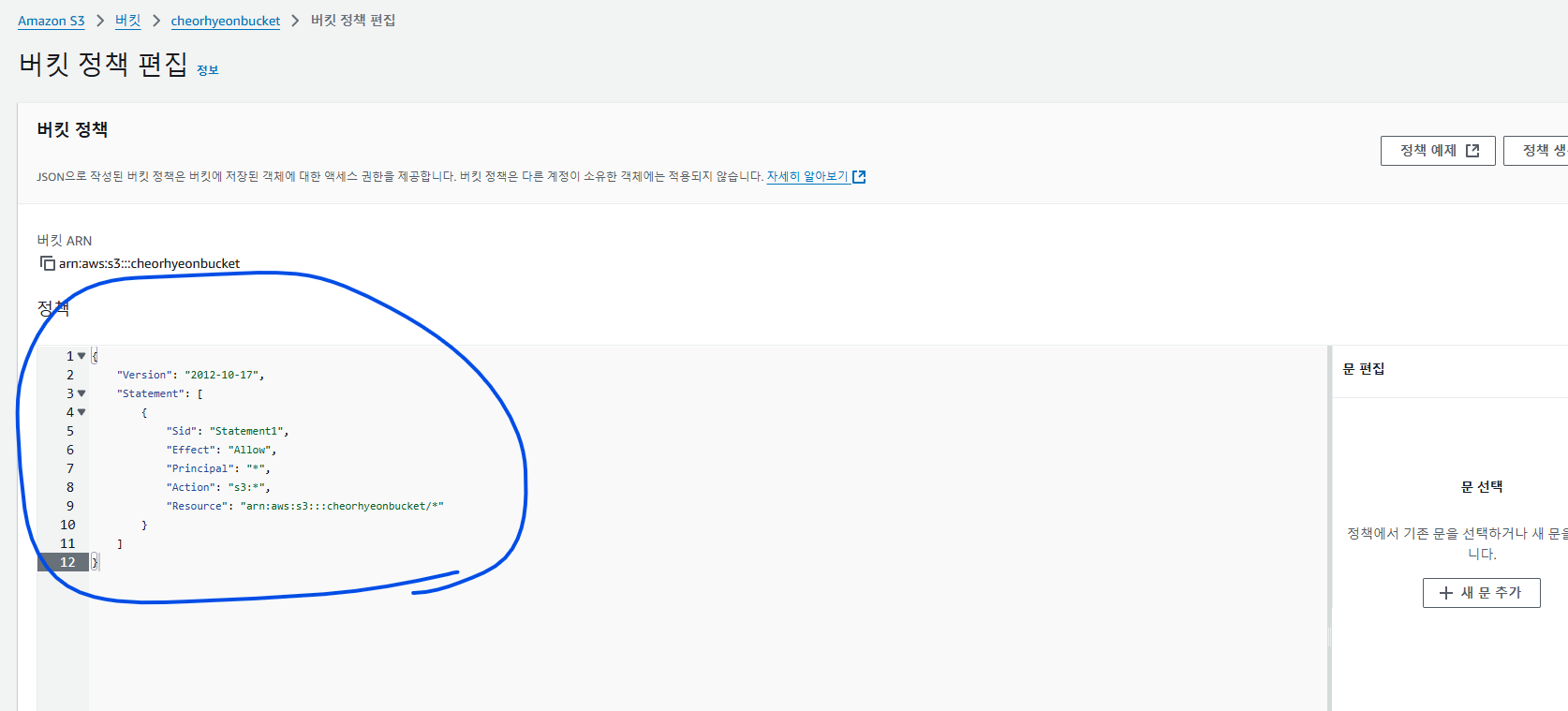 "Action": "s3:*", // 허용할 작업(s3 모든 작업 허용)