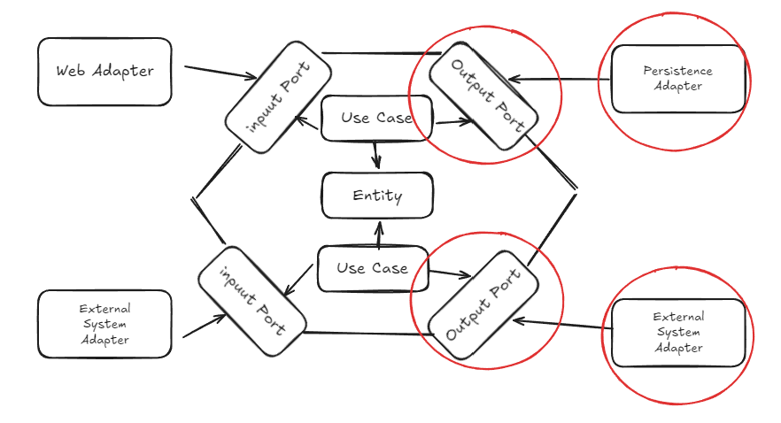 - Use case로부터 호출되어 외부에 결과를 전달하는 것들을 출력 포트, 출력 어뎁터라 볼 수 있음