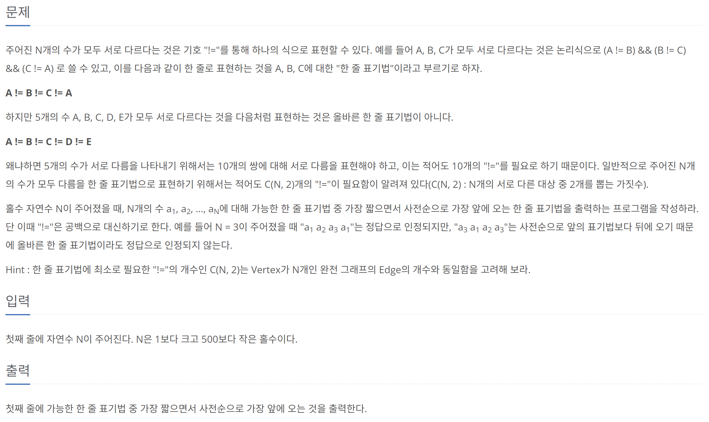 Hint : 한 줄 표기법에 최소로 필요한 "!="의 개수인 C(N, 2)는 Vertex가 N개인 완전 그래프의 Edge의 개수와 동일함을 고려해 보라.