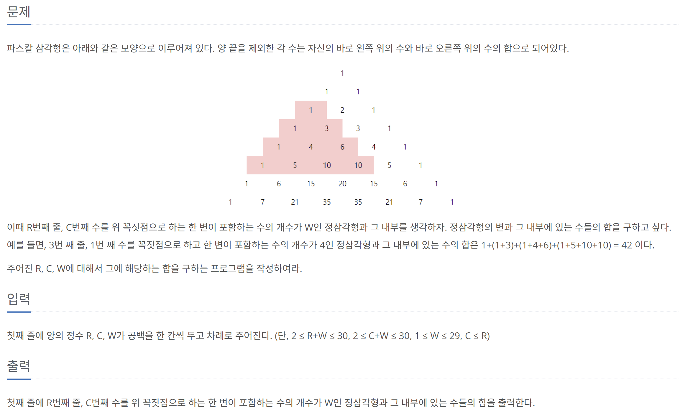 점화식을 통해 미리 파스칼 삼각형을 구한 뒤 합을 구하면 됩니다.