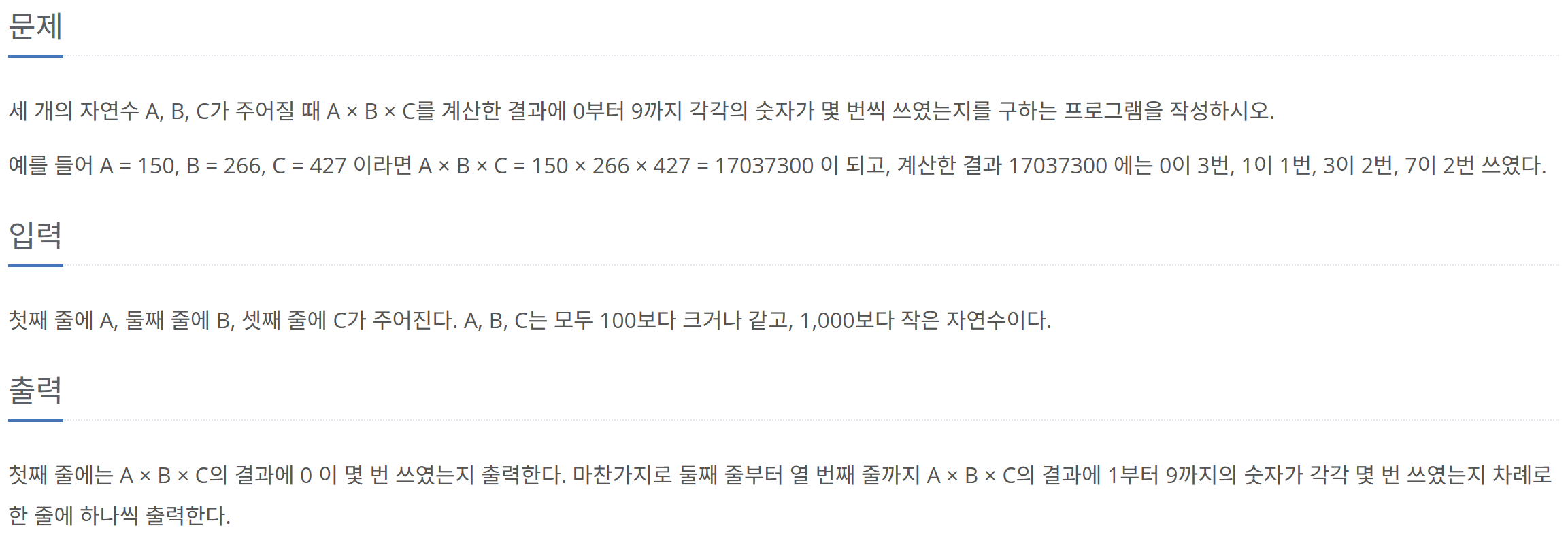 A, B, C를 곱한 뒤 10의 나머지에 해당하는 숫자를 세어주고 10을 나누어주다 보면 수가 0에 도달합니다.