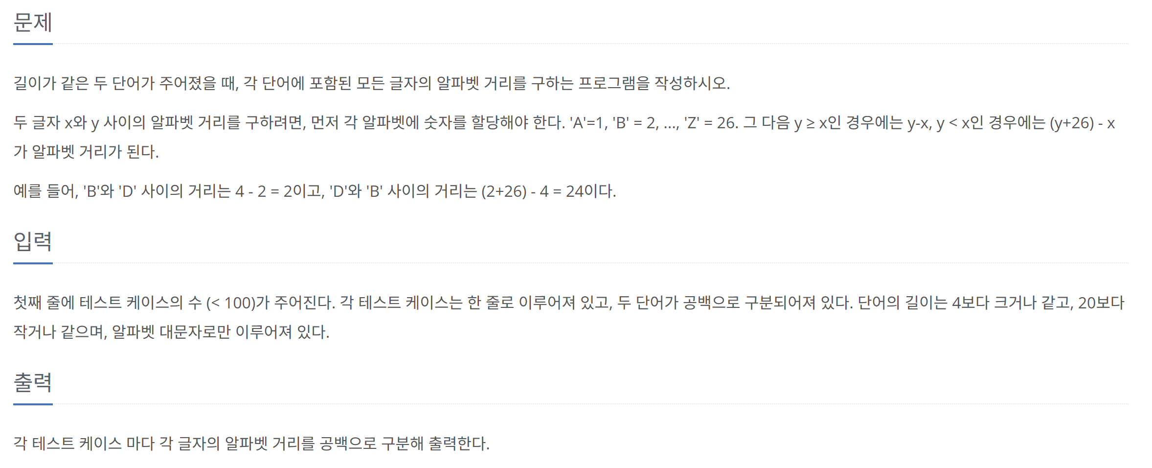 즉 두 알파벳을 빼면 나오는 값은 알파벳 거리라고 할 수 있습니다.