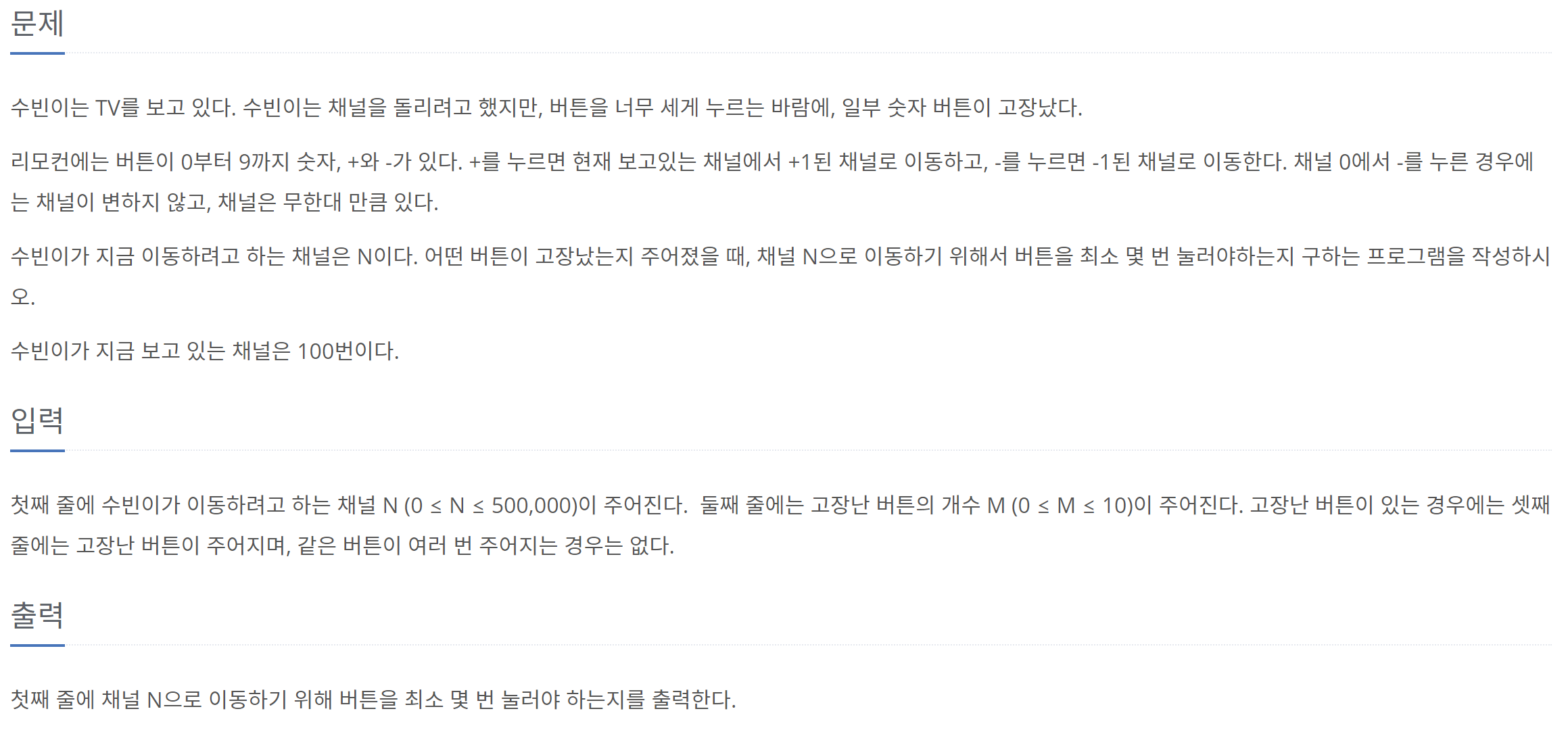 100으로 확인해 본 뒤 리모컨으로 가능한 숫자 조합을 확인해 보며 N과의 차가 제일 적은 값을 출력하면 된다.