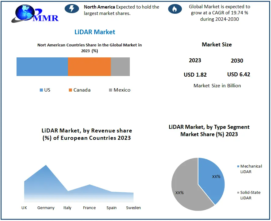 The size of the LiDAR market was estimated at USD 1.82 billion in 2023, and it is anticipated that overall LiDAR revenue will increase at a compound annual growth rate (CAGR) of 19.74% between 2024 and 2030, reaching almost USD 6.42 billion.