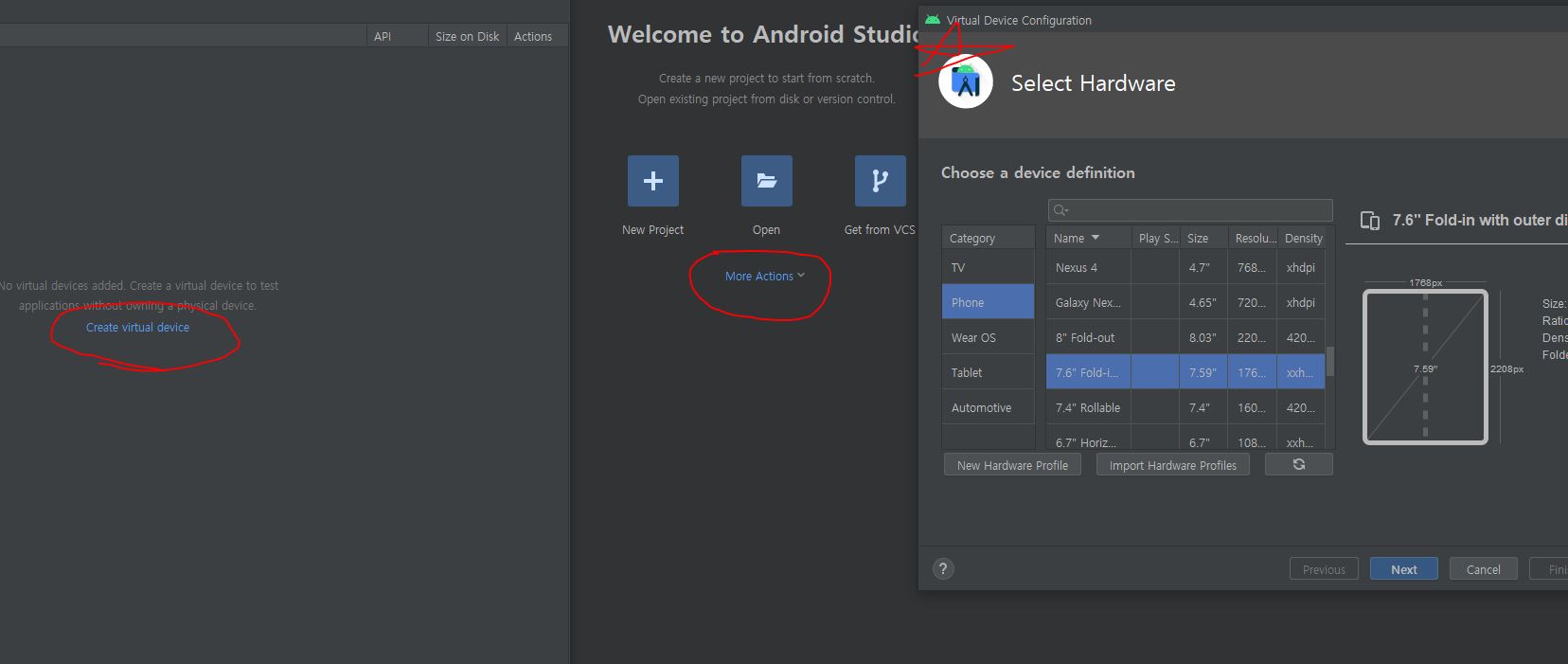 안드로이드 스튜디오로가서 MoreAciton - C V D - 제일 작은화면으로 하는걸 추천