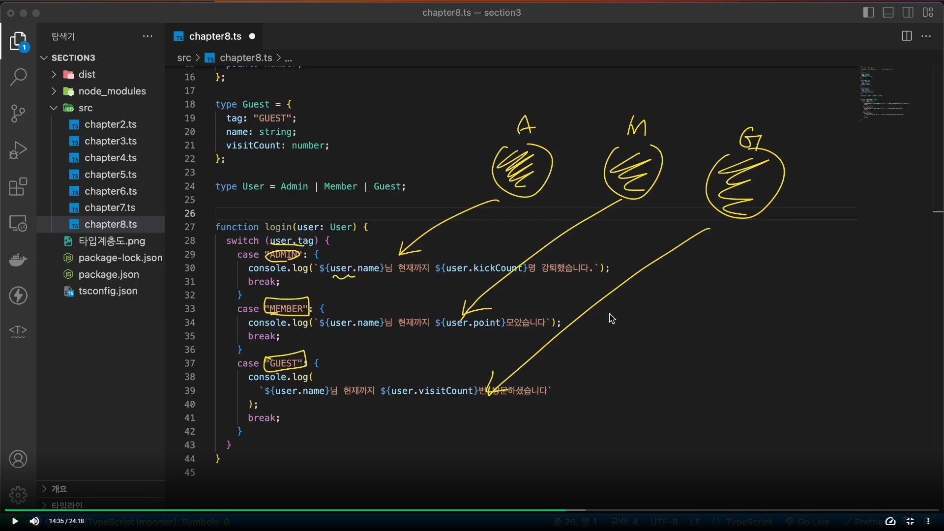아래 실행 코드만 보면 user가 누구인지 알 수 없어서 스크롤해서 타입 유저들을확인해야함