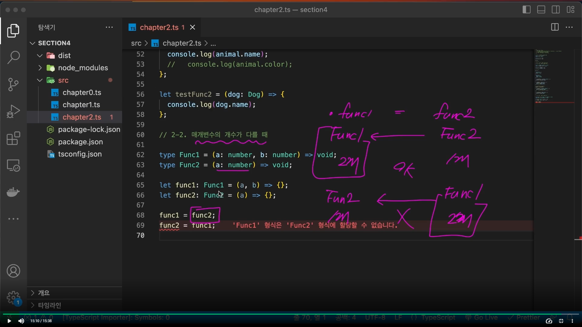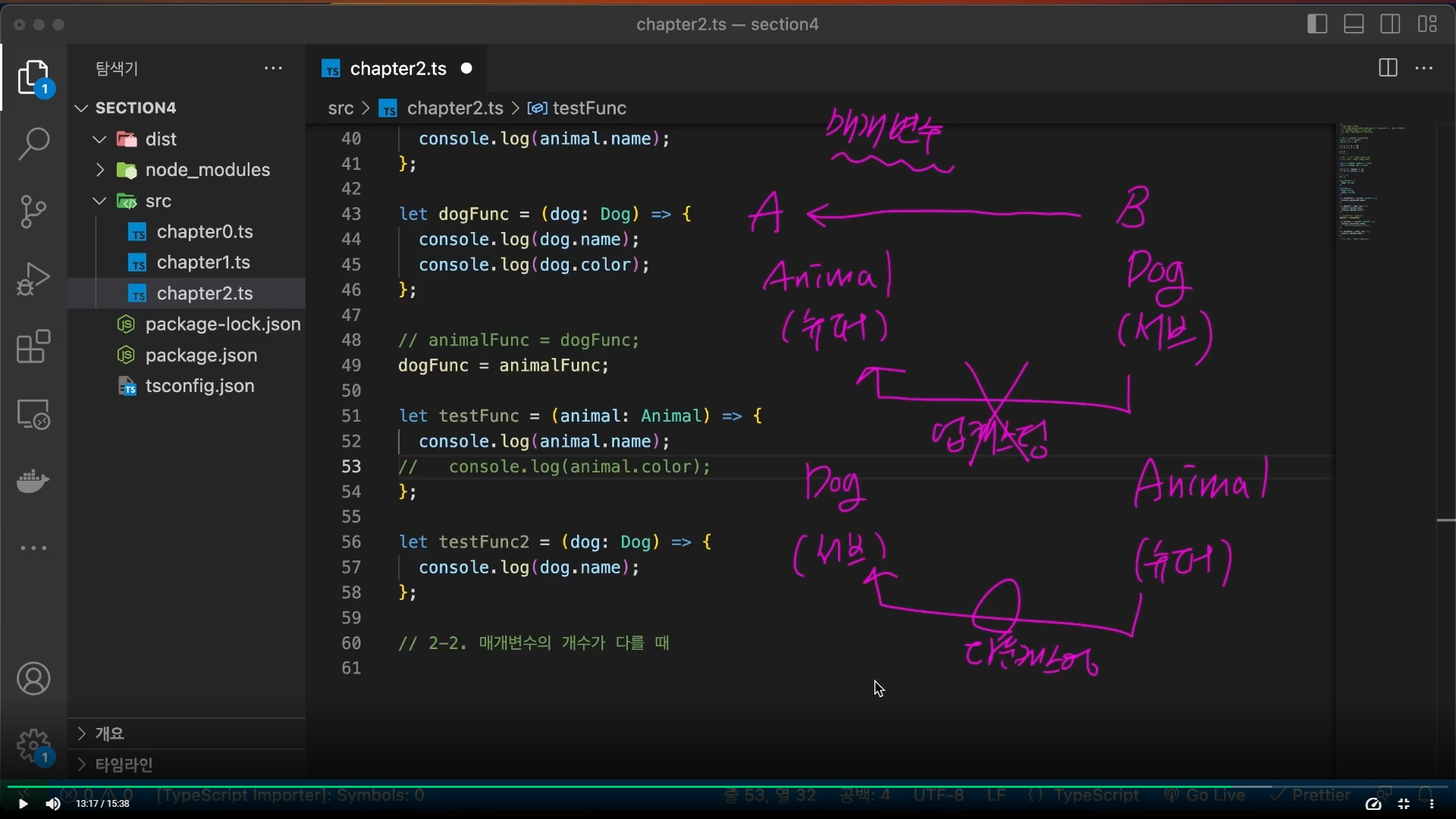 let tsetFunc = (animal: Animal) => { 업캐스팅 코드를 풀어쓴 코드입니다.