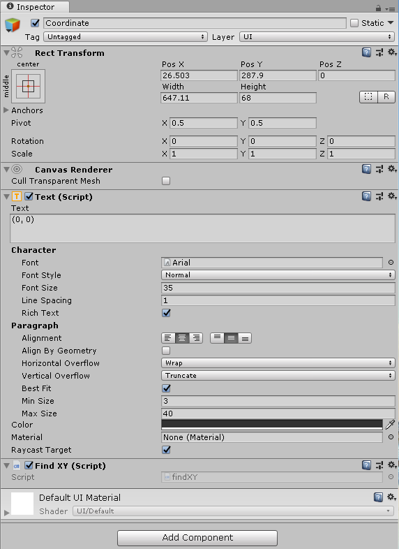1 2 3 4 5 6 7 8 9 10 11 12 13 14 15 16 17 18 19 20 21 22 23 24 25 26 27 28 29 30 31 32 | using System.Collections; using System.Collections.Generic; using UnityEngine; using UnityEngine.UI; public class findXY : MonoBehaviour { private Text coordinate; private string coor_format = "({0}, {1})"; private float X; private float Y; public void SetX(Scrollbar sb) { X = sb.value; coordinate.text = string.Format(coor_format, X.ToString(), Y.ToString()); } public void SetY(Scrollbar sb) { Y = sb.value; coordinate.text = string.Format(coor_format, X.ToString(), Y.ToString()); } void Start () { coordinate = GetComponent<Text>(); } } | cs |