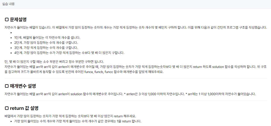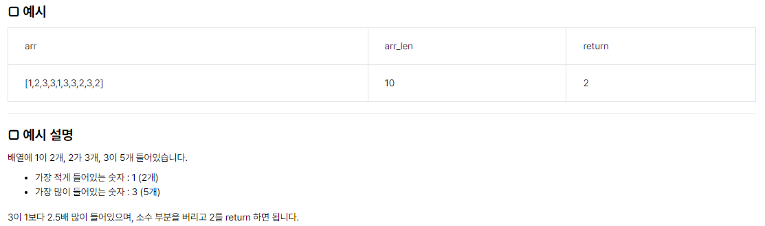 class Main { int[] func_a(int[] arr){ // arr[]의 값을 counte[]의 인덱스로 활용해 해당 숫자가 몇개 있는지 세는 함수 int[] counter = new int[1001]; for(int i = 0; i < arr.length; i++) counter[arr[i]]++; return counter; } int func_b(int[] arr){ // arr[0]번째부터 반복문을 돌려 "가장 많이 등장하는 수"의 개수를 구하는 함수 int ret = 0; for(int i = 0; i < arr.length; i++){ if(ret < arr[i]) ret = arr[i]; } return ret; } int func_c(int[] arr){ // 가장 적게 등장하는 수의 개수를 구하는 함수 final int INF = 1001; int ret = INF; for(int i = 0; i < arr.length; i++){ if(arr[i] != 0 && ret > arr[i]) ret = arr[i]; } return ret; } public int solution(int[] arr) { int[] counter = func_a(arr); int maxCnt = func_b(counter); int minCnt = func_c(counter); return maxCnt / minCnt; }